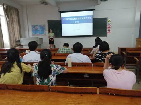 会议的第二个议程是3-4月外出参加培训学习的教师作学习汇报,李颖老师3月份参加了“2019年高校思想政治理论课骨干教师研修”,并把相关学习内容及学习过程作了汇报;潘莲娣老师参加了4月份召开的2019年春季“形势与政策”备课会,并把备课会的主旋律和重要精神作了汇报,梁伟莹老师参加了2019年全省高校思想政治工作年会,并抽取会议资料“2018年度广东高校思想政治工作经验材料汇编”中值得推广和学习的内容作了汇报。