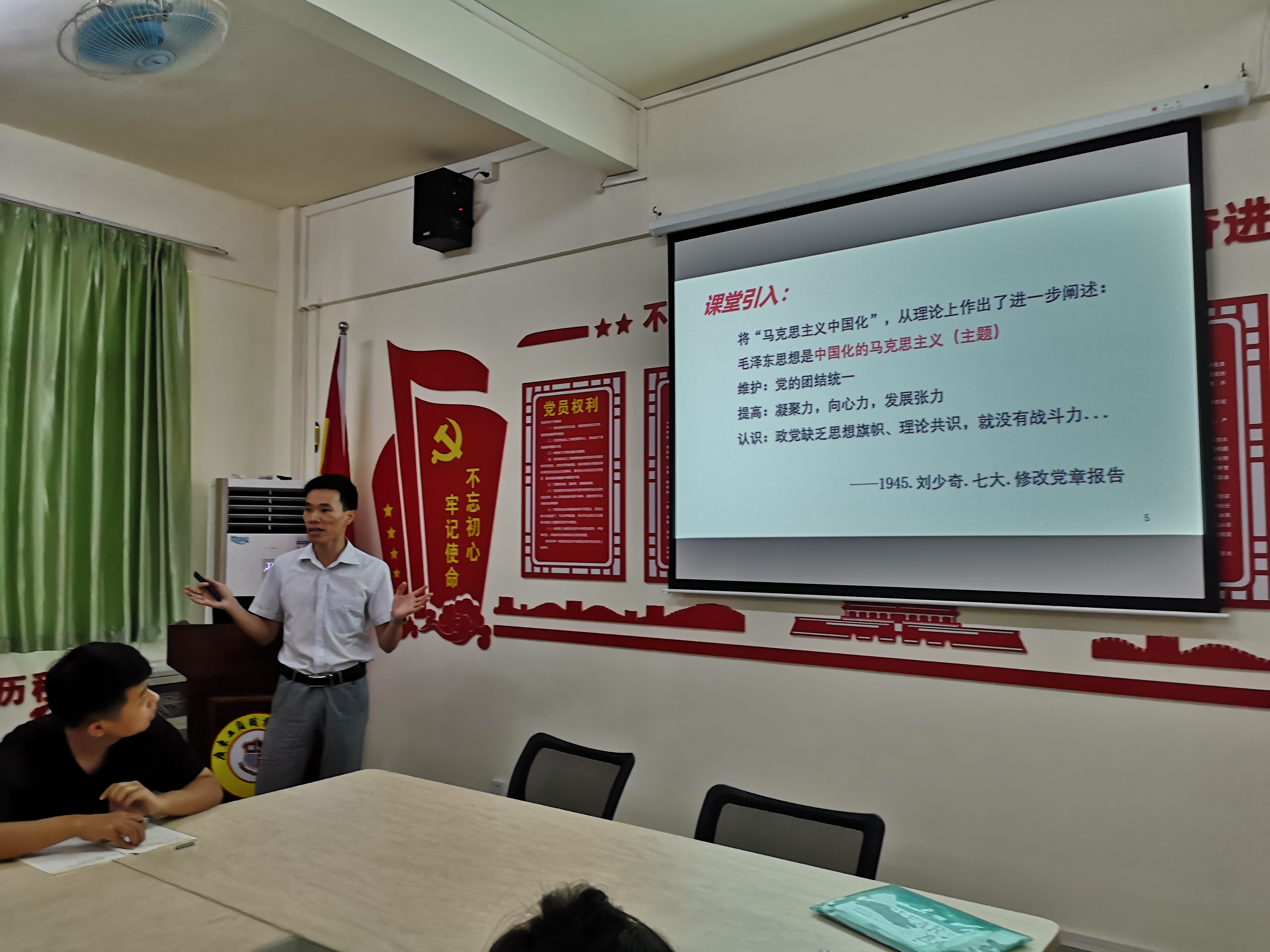 蒙裕、朱德新两位老师先后进行了课程试讲。蒙裕老师的试讲内容为第一章第二节毛泽东思想,蒙裕老师通过问题导入课程,并结合相关案例,尤其是结合我国抗击疫情案例,具体分析了毛泽东思想实事求是、群众路线和独立自主的活的灵魂。朱德新老师试讲的内容是第二章第二节新民主主义革命的总路线和基本纲领,朱老师以视频导入课程,先后讲解了新民主主义革命总路线的概念和新民主主义革命的基本内容。
