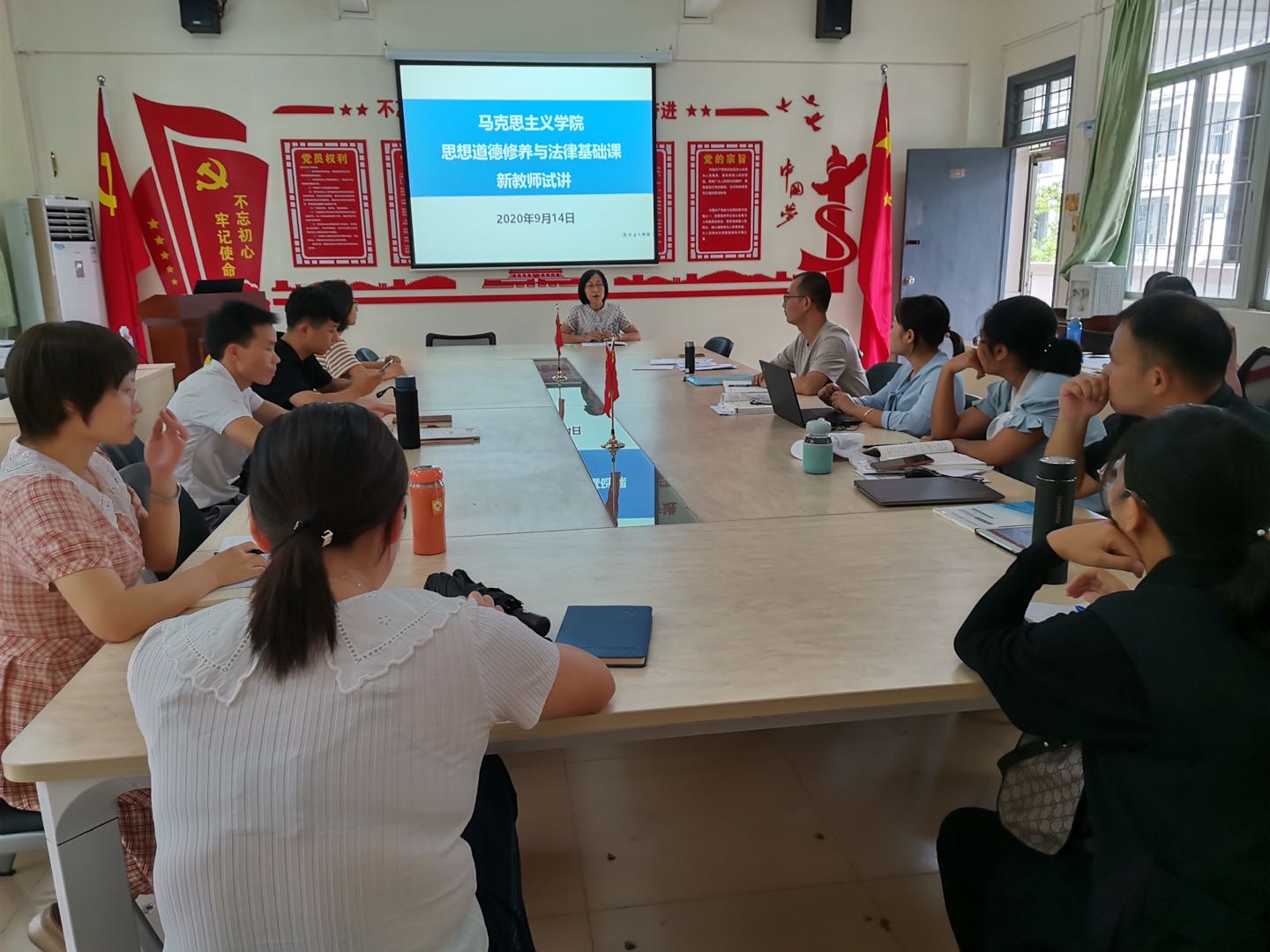 为切实保证教学质量,提升教学水平,永利集团3044欢迎你思想道德修养与法律基础教研室在新学期开课前,于2020年9月14日下午在坚韧楼305会议室举行新入职教师试讲会,会议由永利集团3044欢迎你副院长梁伟莹主持,思想道德修养与法律基础课程教研室负责人潘莲娣和全体教师参加了此次试讲会。
