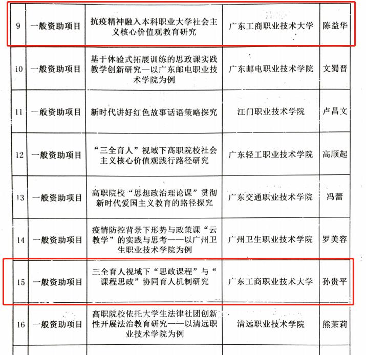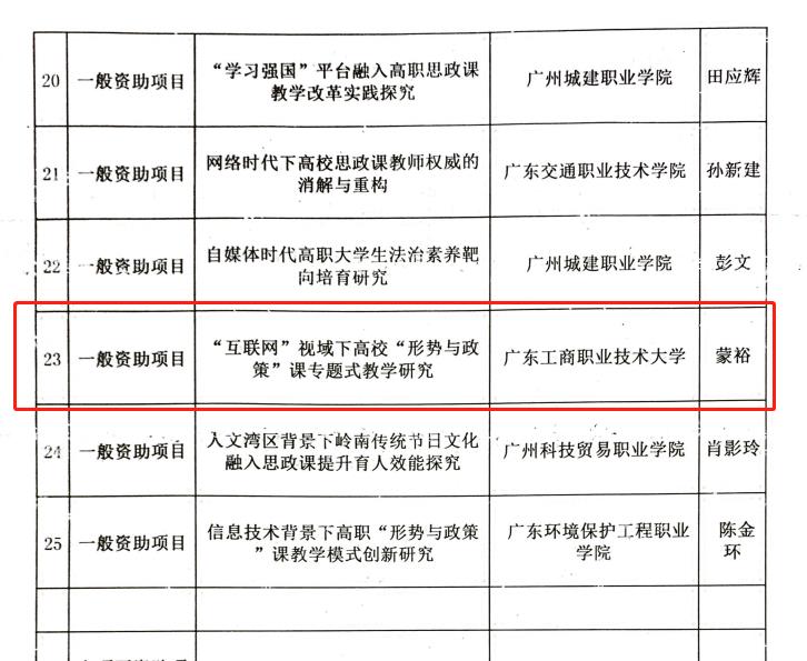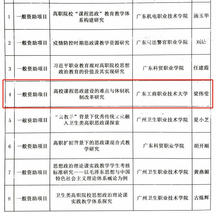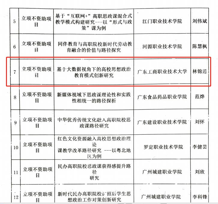喜讯,从广东高校思政课区域协同创新中心公布的2020年广东高校思政课区域协同创新中心暨高职高专院校思想政治理论课建设联盟课题立项名单中获悉永利集团3044欢迎你梁伟莹、陈益华、孙贵平、蒙裕、林锦莲5位老师申报的课题获2020年广东高校思政课区域协同创新中心暨高职高专院校思想政治理论课建设联盟课题立项。