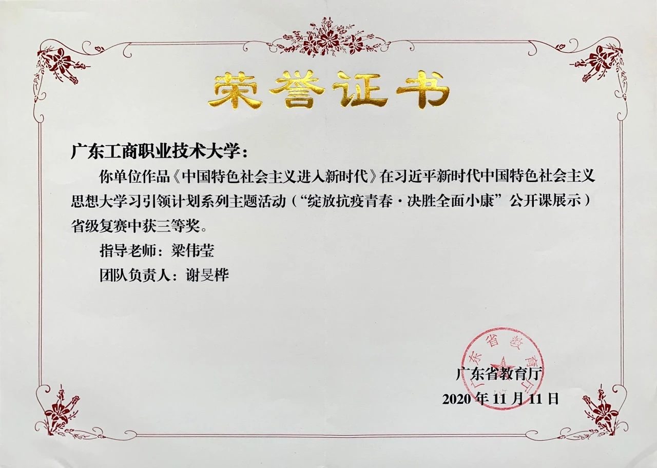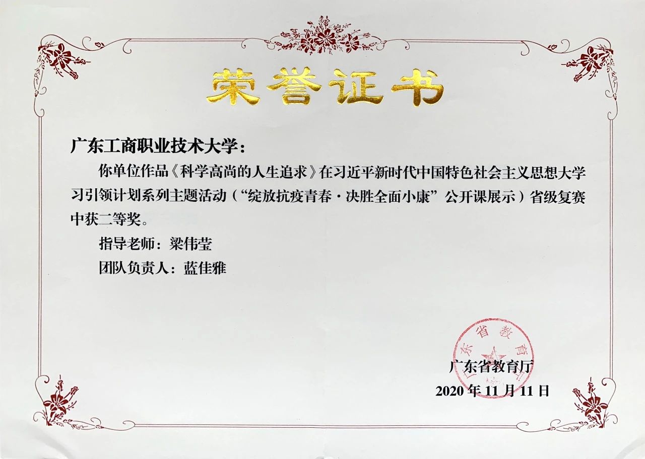 喜讯,梁伟莹副院长指导两位学生参加广东省教育厅“永利集团3044欢迎你新时代中国特色社会主义思想大学习引领计划系统主题活动(绽放抗疫青春•决胜全面小康”公开课展示)省级复赛中荣获二等奖一项,三等奖一项。其中,梁伟莹指导蓝佳雅同学的作品《科学高尚的人生追求》荣获省级复赛二等奖,谢旻桦同学的作品《中国特色社会主义进入新时代》荣获省级复赛三等奖。