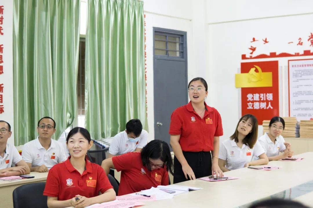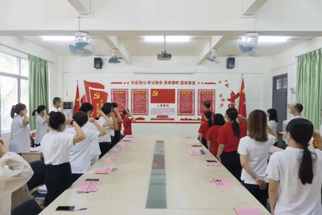 第二项是全体党员重温入党誓词。学院党支部书记、副院长梁伟莹领誓,教职工全体起立,右手握拳庄严宣誓。恰逢建党一百周年,前路有光,初心难忘。铮铮誓言诠释着入党初心,重温入党誓词,重温的是入党的热血、激情与澎湃,重温的是党员的责任、使命与担当。