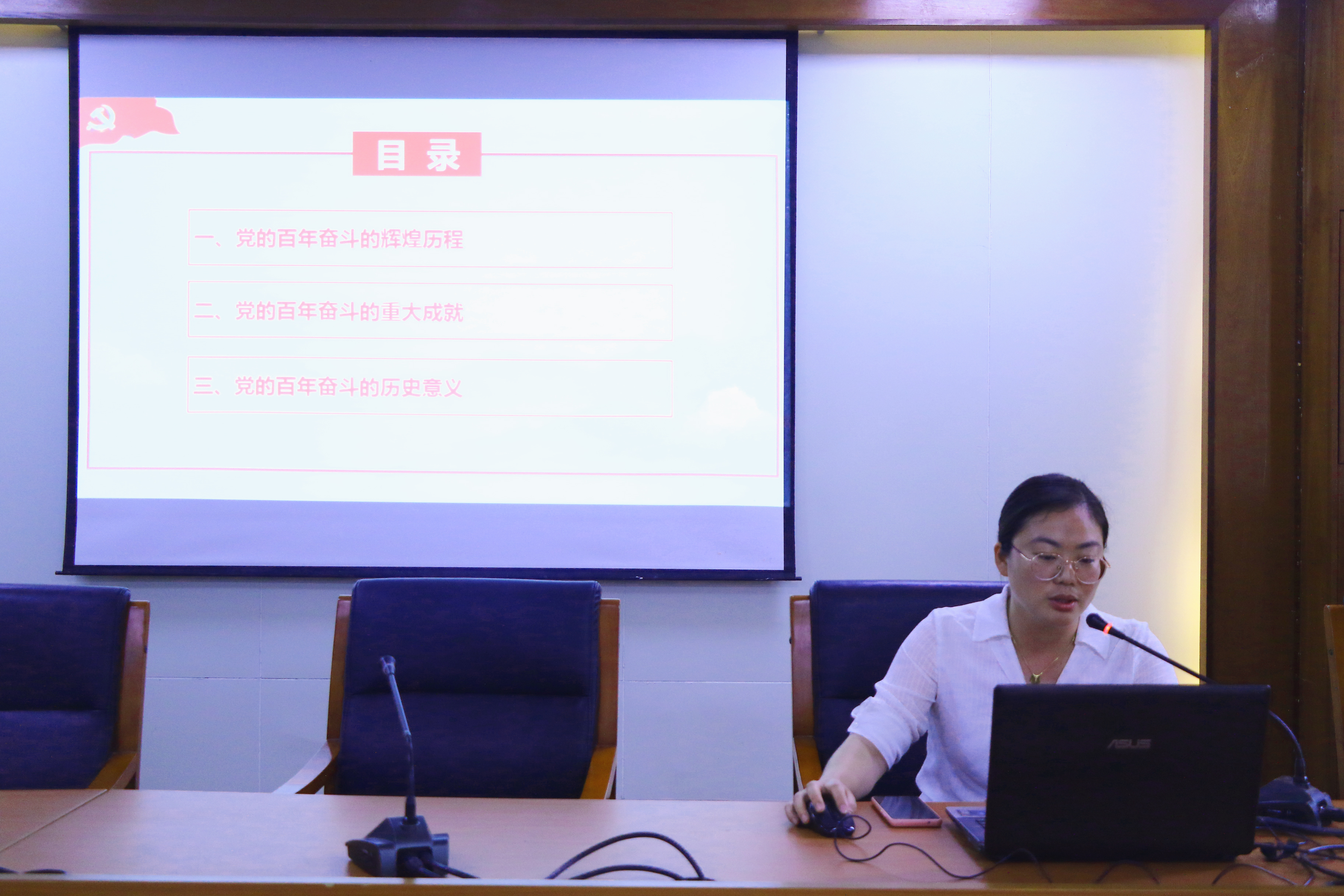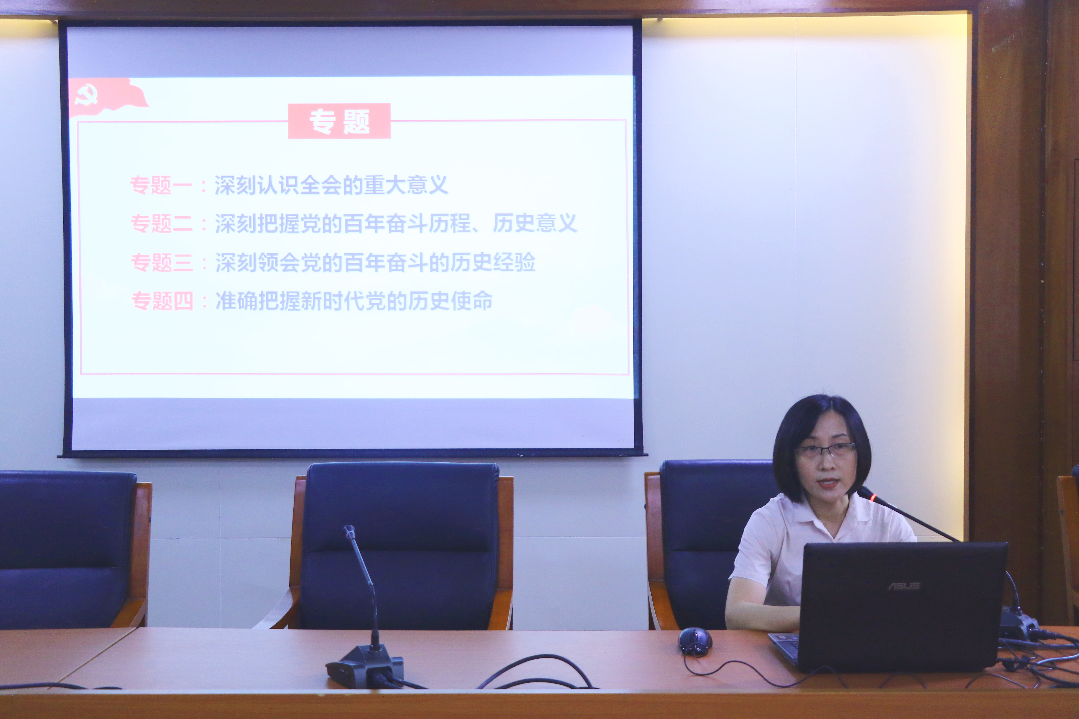 在开班仪式上,党委书记叶峥嵘对培训班的提出了学习要求,本次培训班共分四个专题讲授,26日下午,梁伟莹老师讲授专题一“深刻认识全会的重大意义”,从十九届六中全会的背景概况、内容框架、重大意义三个方面进行介绍;李颖老师讲授专题二“深刻把握党的百年奋斗历程、历史意义”,从党的百年奋斗的辉煌历程、重大成就、历史意义三个方面概括。27日下午,潘莲娣老师讲授专题三“深刻领会党的百年奋斗的历史经验”,从马克思主义中国化的三次飞跃、新时代的历史性成就和历史性变革、党的百年奋斗的历史意义三个方面进行讲授;孙贵平老师讲授专题四“准确把握新时代党的历史使命”,从深刻认识以史为鉴、开创未来的要求、不忘初心推进中华民族伟大复兴、迎接党的二十大召开三个方面展开。