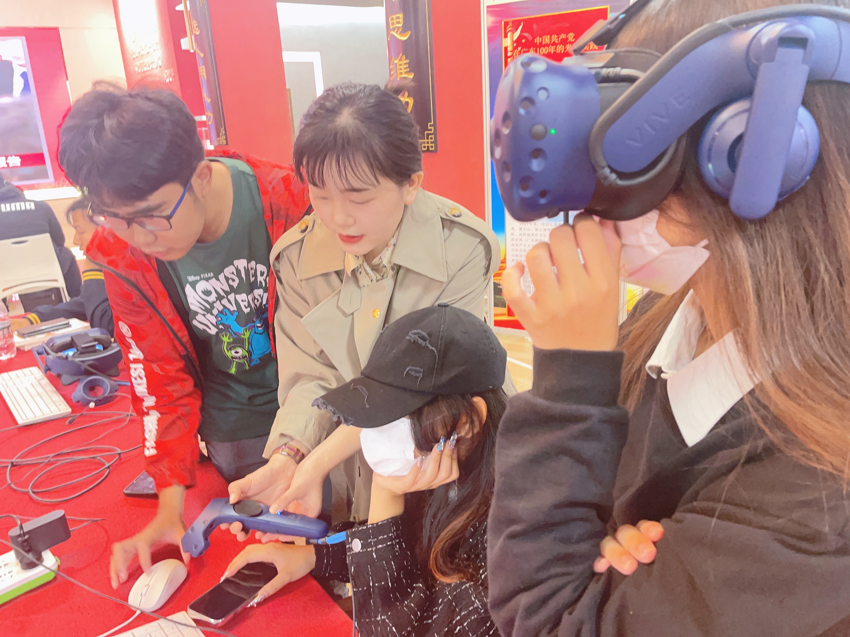 教师耐心指导学生进行VR体验